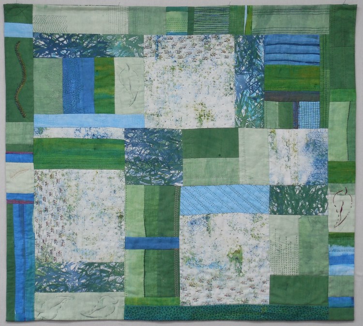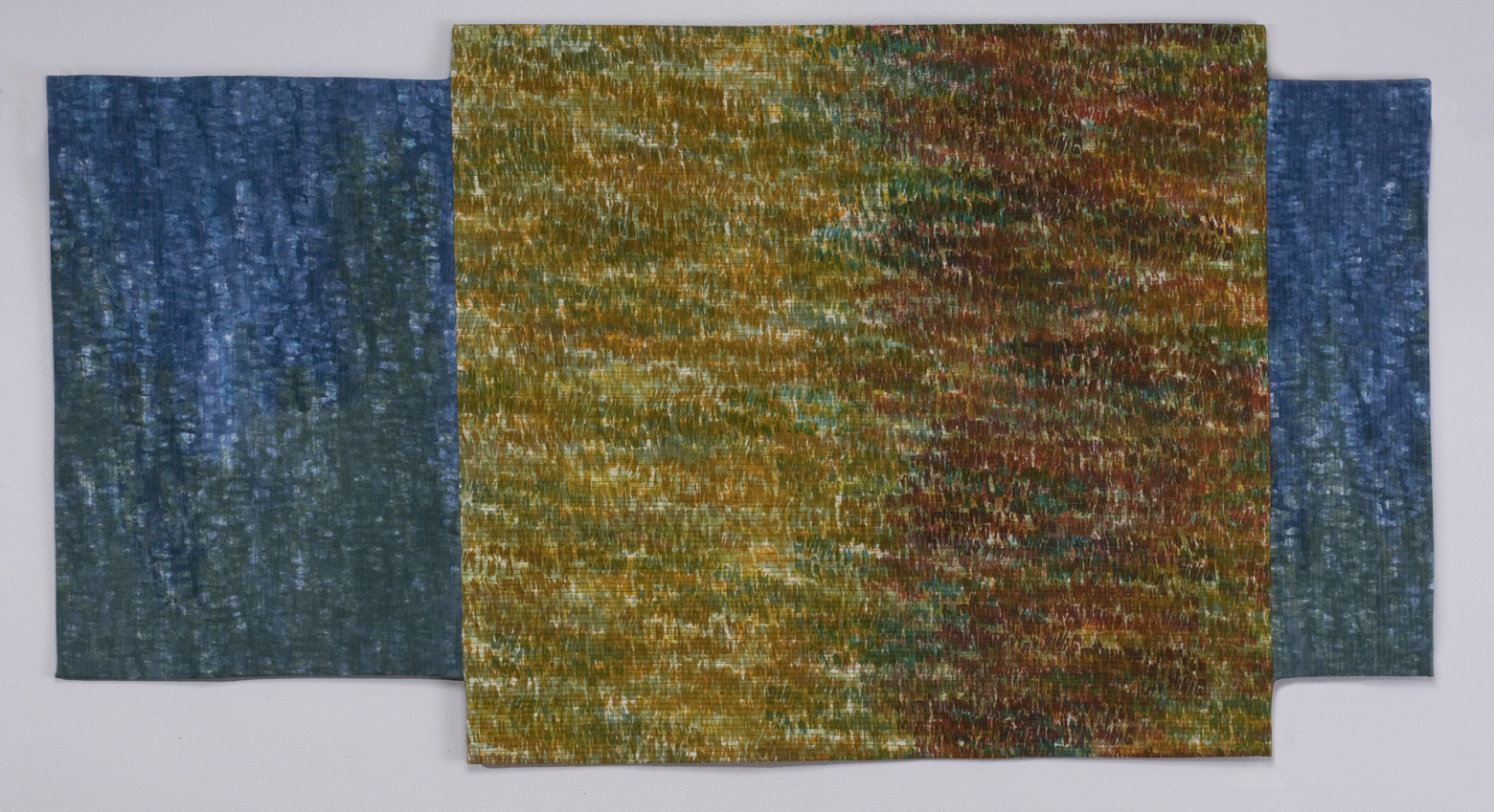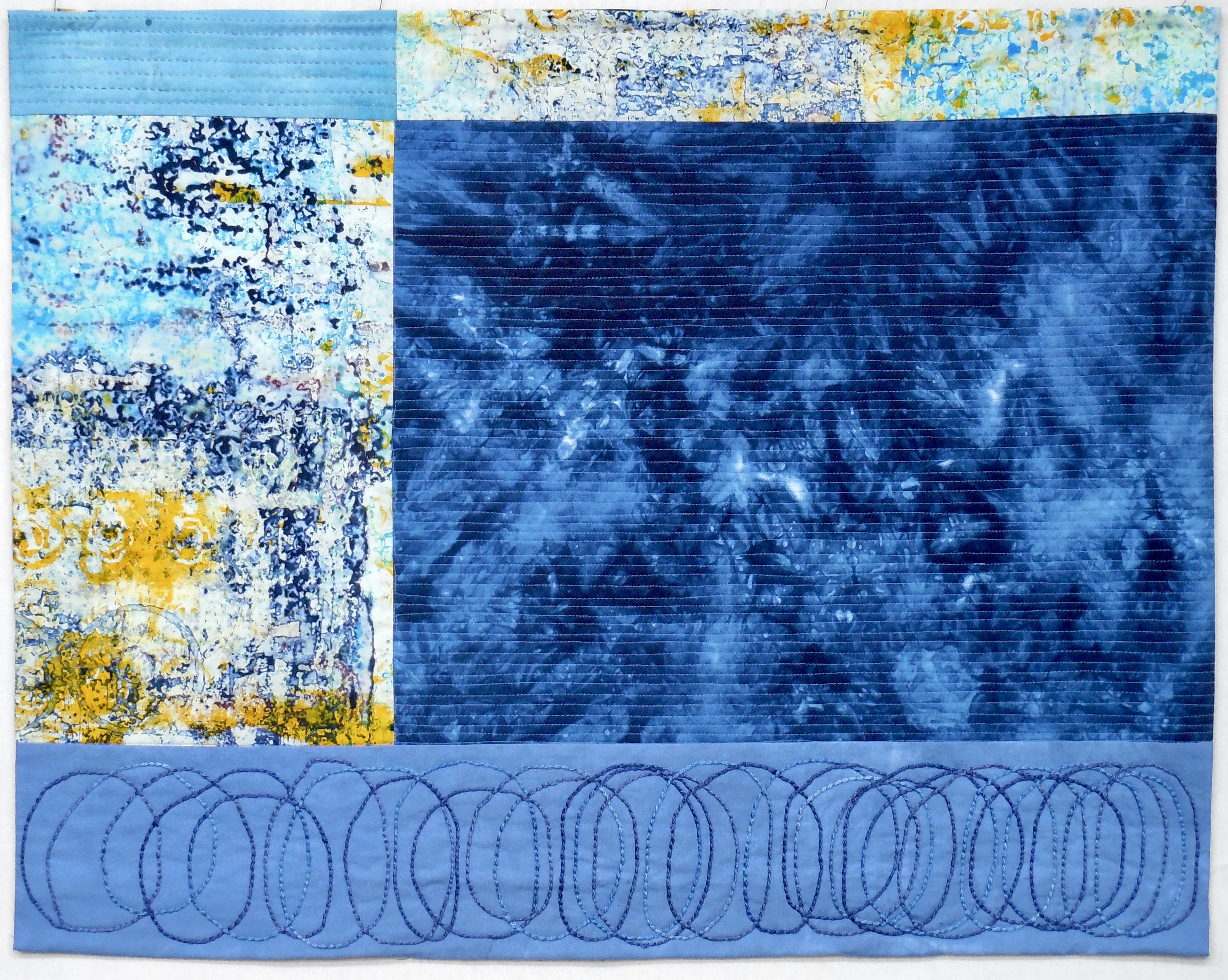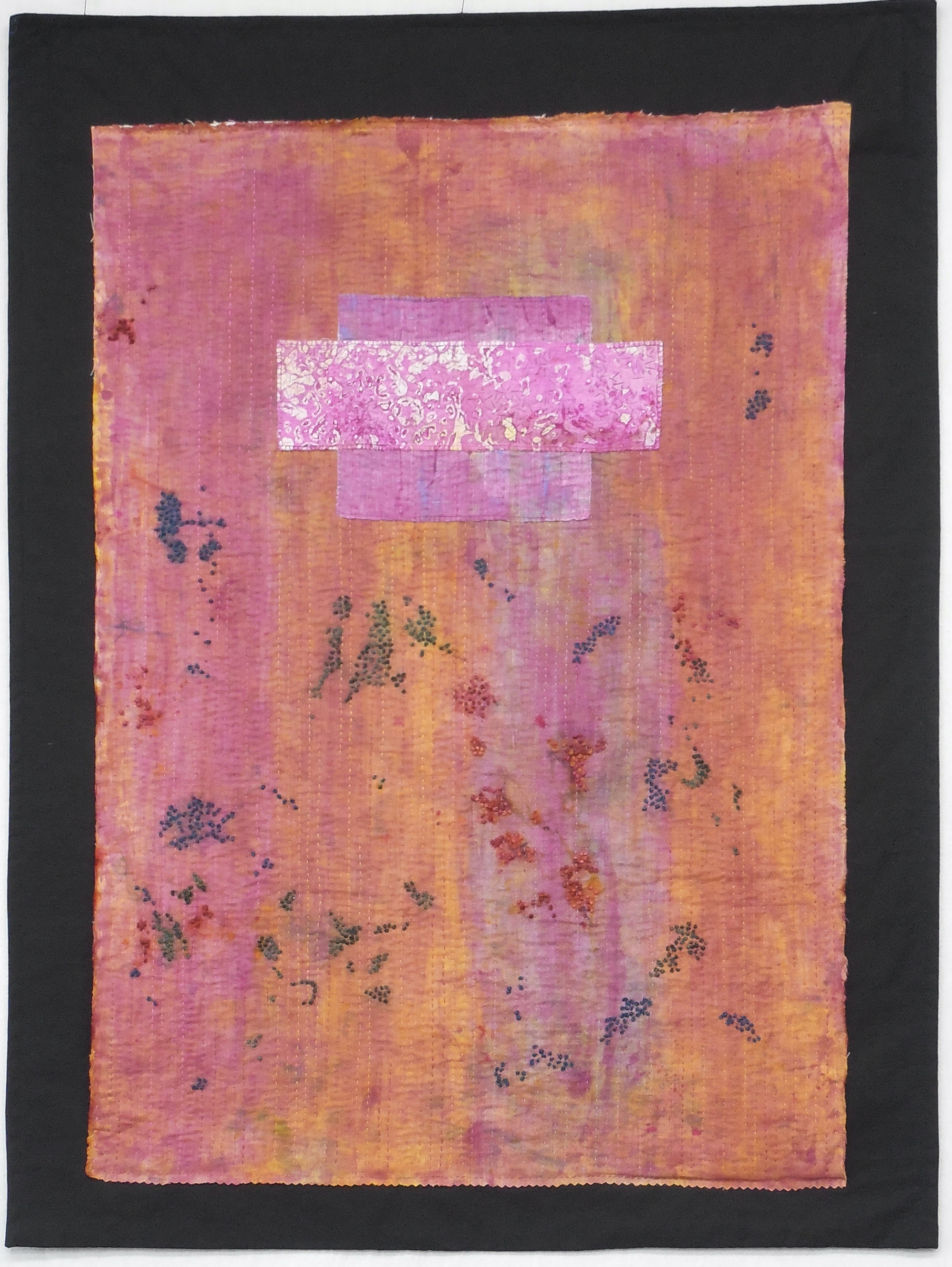 Foggy Morning (35.5 x 40”) hand dyed cotton and linen, hand stitchedFoggy Morning (35.5 x 40”) hand dyed cotton and linen, hand stitchedFlorida Myrtles (28 x 34”) hand dyed cotton, hand stitched, embellished with beads and assorted threads SOLDJust One (60 x 21.25) Hand dyed linen, machine stitched Can be hung vertical or horizontalJust Two ( 62 x 22”) Hand dyed fabric, machine stitched Can be hung vertical or horizontal