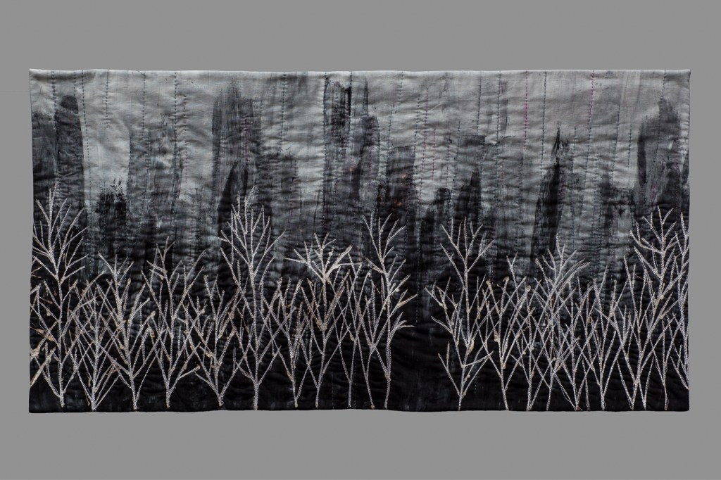 Work from 2015 City Scape #2 – White Trees – 19.5″ x 39.5″ – Hand dyed cotton, discharged, machine and hand quilted