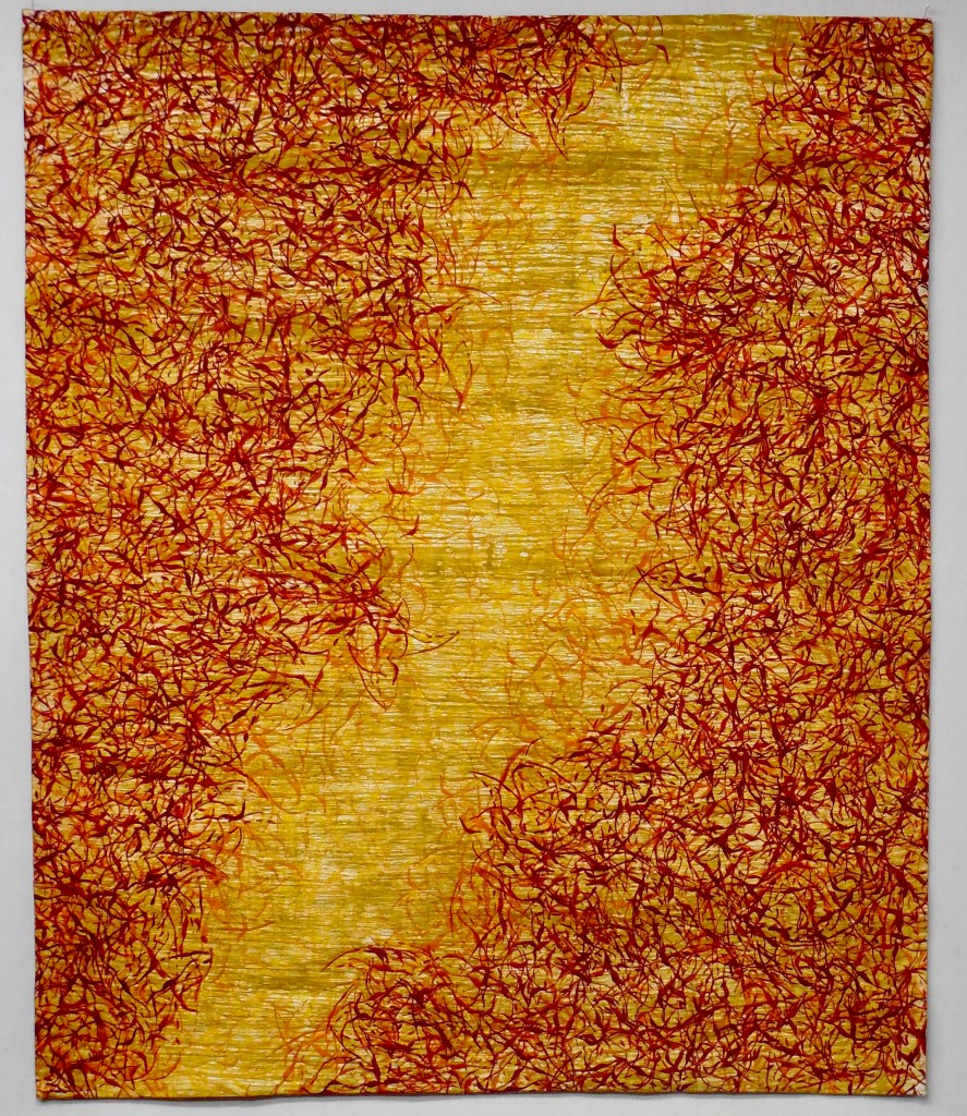 Saffron Path – 41″ x 34.2 ” – Hand dyed cotton, hand quilted